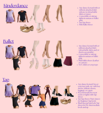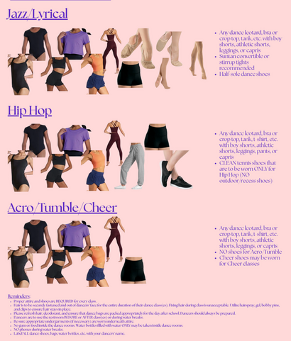 Dressing properly for dance class helps students feel confident, safe, and ready to learn. The right attire allows for freedom of movement, promotes good technique, and creates a unified classroom environment. Below you’ll find examples of what to wear for each class.
