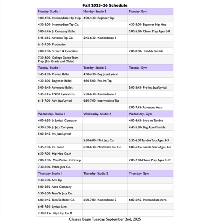 At L Mace Studios, we make it easy to find the perfect class for your dancer! From ballet and jazz to tumble, acro, and cheer, our schedule is designed to offer something for every age and level. Browse the full fall schedule below to see class times, age groups, and room locations—then get ready to dance with us this season!